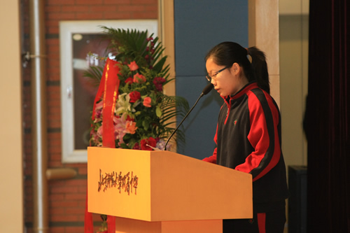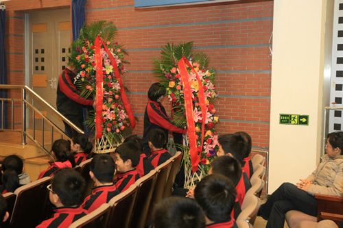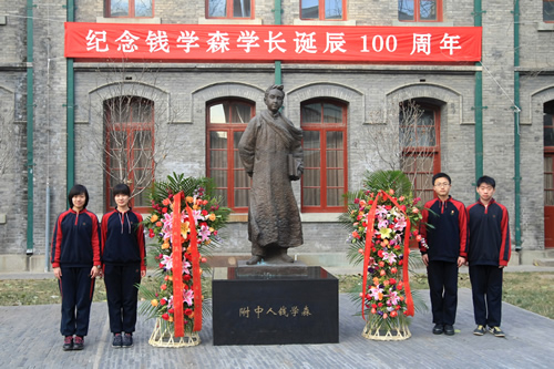 学生代表向矗立在校园内的钱学森铜像敬献花篮, 表达全校师生对老学长的无比景仰和怀念。 在钱老诞辰百年这个特殊的日子,附中莘莘学子一道承诺:发奋读书,全面发展,为中华民族的伟大复兴而努力终生。