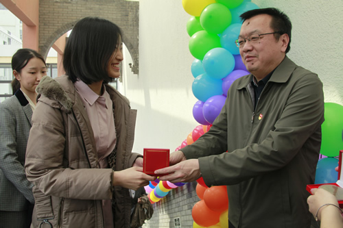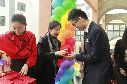 热闹的气氛从中午下课便开始充满整个校园,每个人盛装出现在大家眼前时的那一声声赞许的惊呼便早早预热了属于同学们的盛会。今日的校园举目尽是“绅士”、“淑女”,男生大多西装革履,风度尽显;女生中也有不少人换上了大气成熟的礼服,面容姣好。大家鱼贯走过象征成年的成人门,郑重地从王莉萍校长和许建勇书记手中接过附中精心为同学们准备的成人纪念币,接受老师们诚挚的祝福。