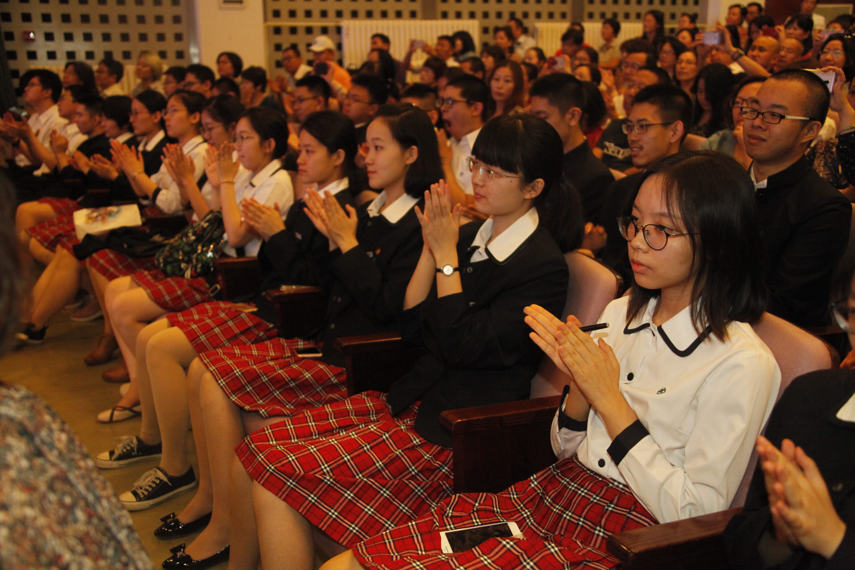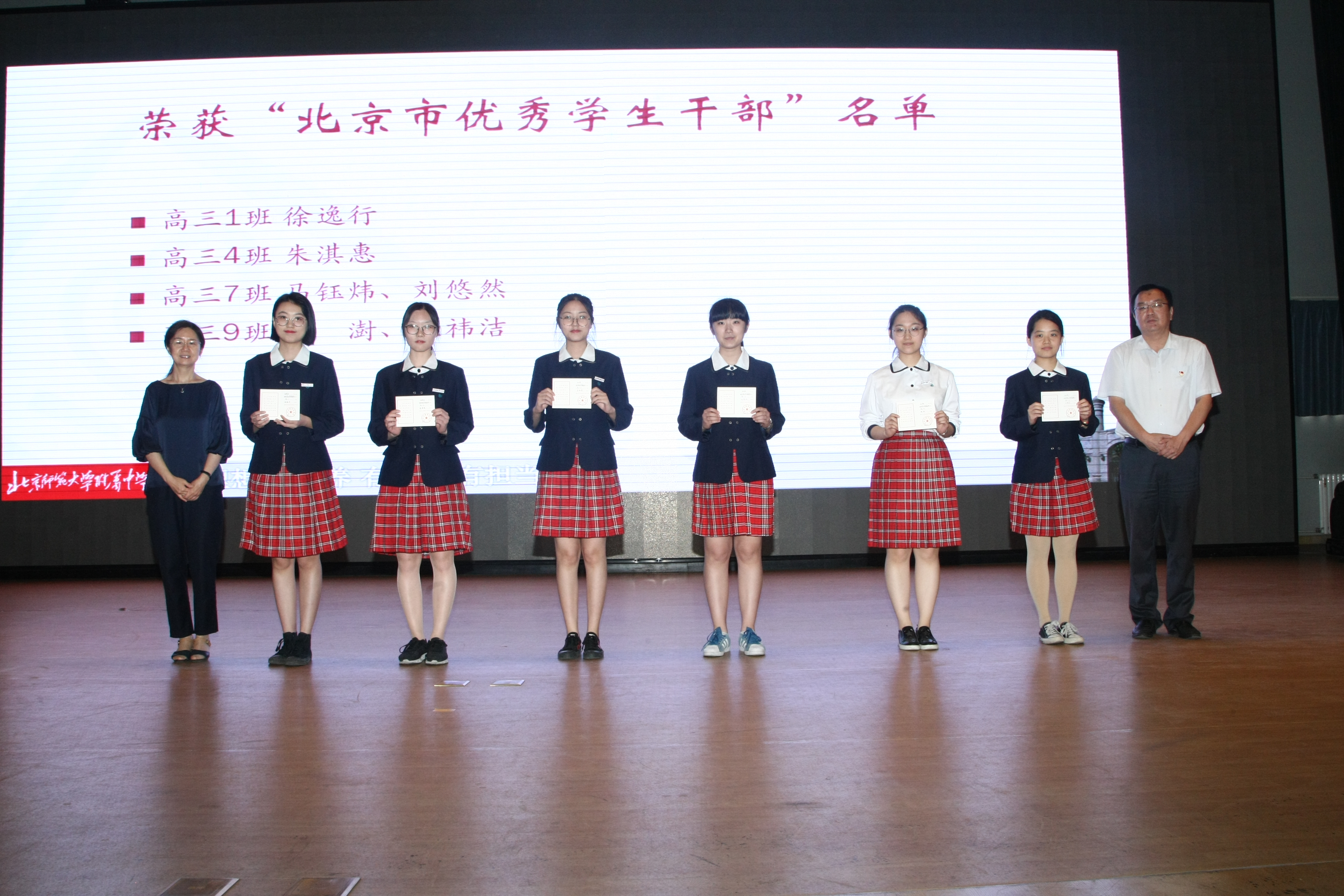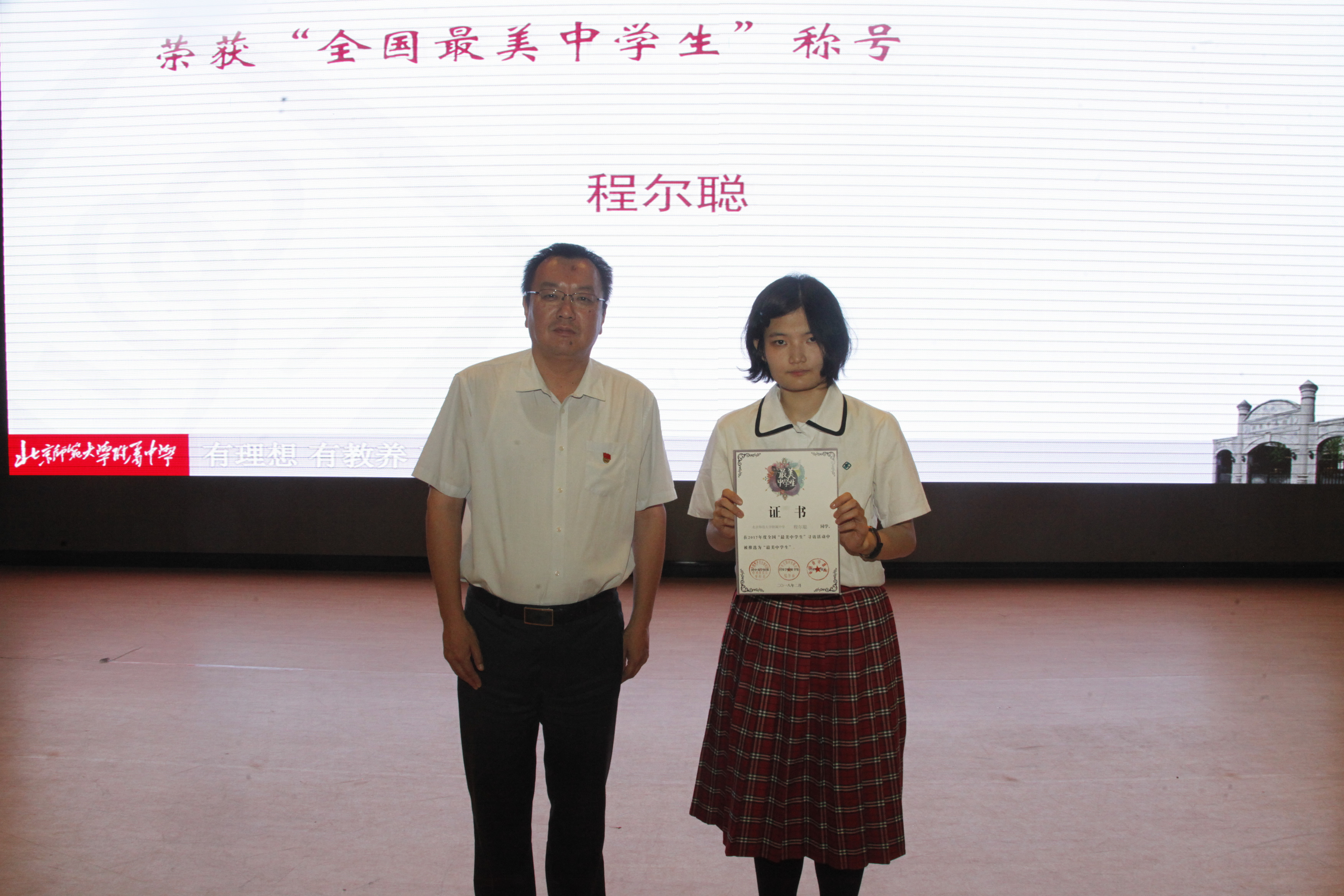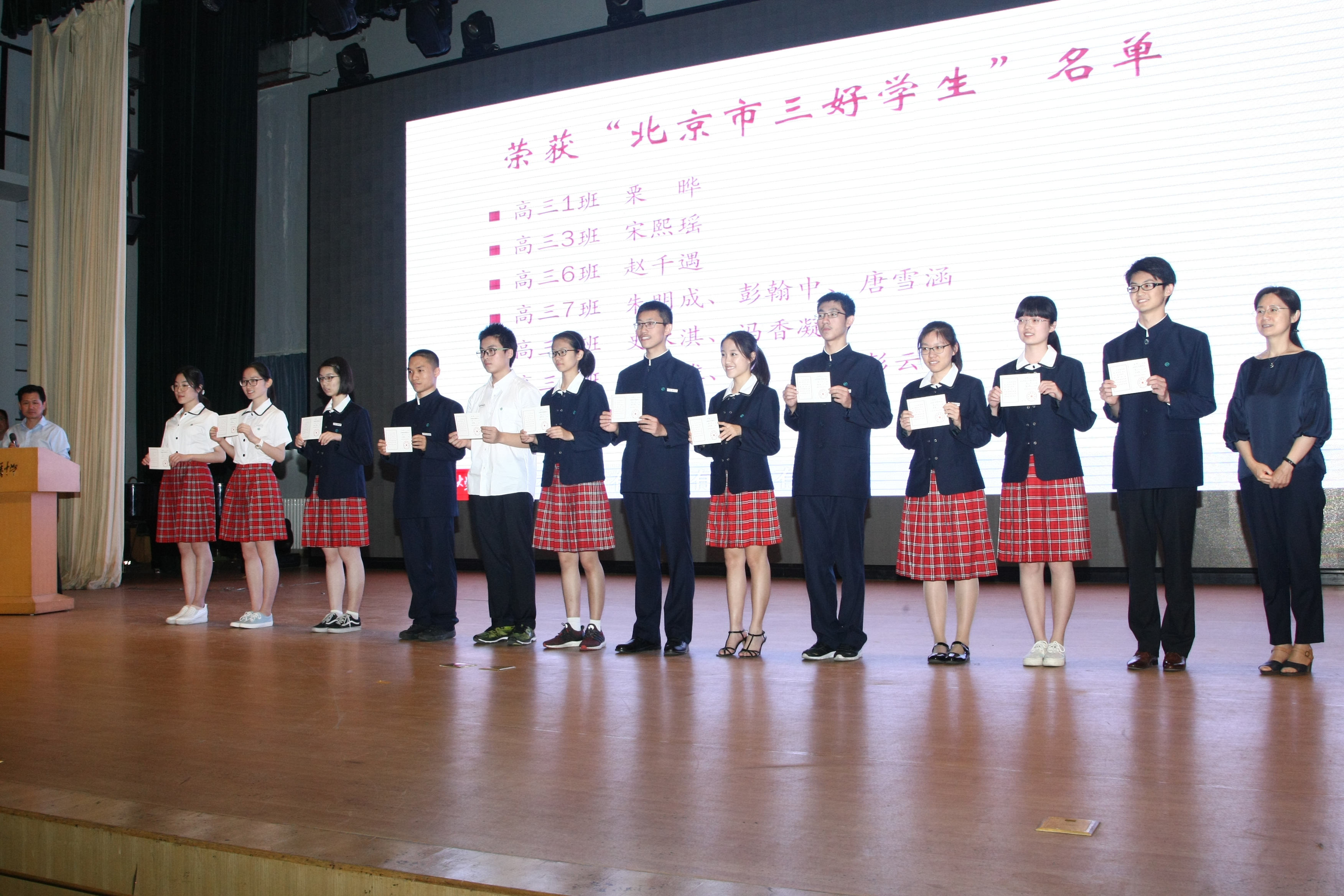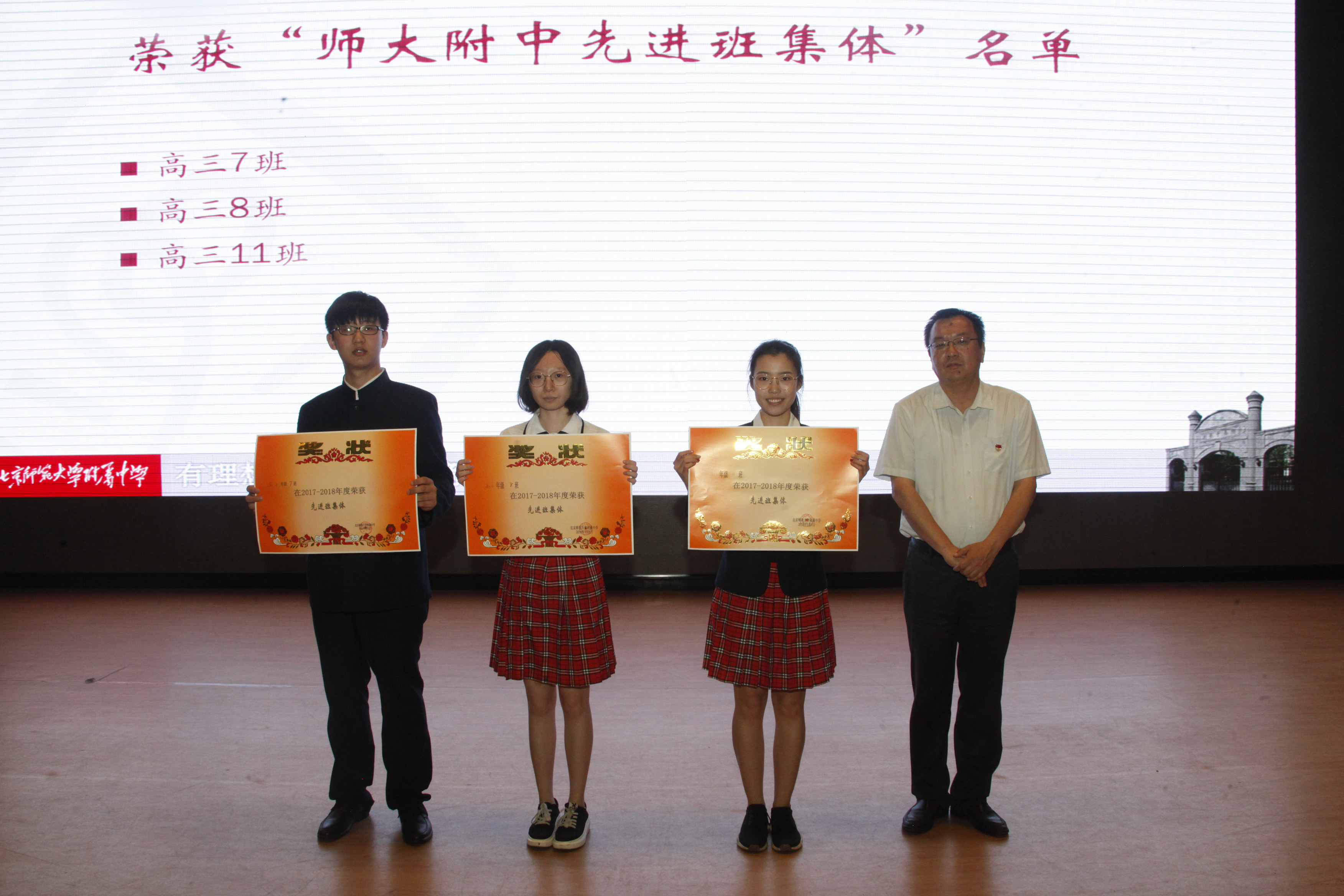 梁原草副校长宣读了市区三好学生、优秀学生干部和优秀班集体的名单。所有人都由衷地为这三年来同学们取得的优异成绩感到骄傲与自豪。高三14班李兰迪同学被评为附中“艺术之星”,高三9班程尔聪同学荣获“全国最美中学生”称号。