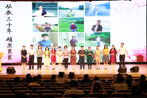 大会上,21位区教育系统优秀教师、优秀教育工作者和1个优秀集体以及6位优秀班主任登台领奖。王莉萍校长、许建勇书记、顾咏梅副校长、李华艳副校长、为从教十年、二十年、三十年、逾三十五年以及班主任龄二十年的31位教师分别颁发了“亭亭如盖”、“花开正红”、“硕果累累”、“桃李天下”“大爱丹心”等从教纪念章。梁原草副校长还为“廿载耕耘 不忘初心”班主任龄逾二十年的班主任颁发了西城区表彰的纪念奖牌。