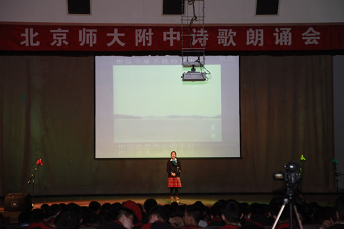 小河轻快的旋律渐渐低沉,化作一条条小溪涓涓溪流般的低吟浅唱。朗诵会进入第三章――“我思故我在”。高一(8)班郭冰峰、吴秉翰同学的原创诗歌《我和他》,一声一声,叩在听众们的心上,引发了同学们的思考。新诗朗诵会伴着高一(5)班李一宁同学深沉而激情的《相信未来》落下帷幕。同学们在诗歌的王国里经历了一次心灵的洗礼与精神的升华。 梁原草副校长前来参加此次朗诵会并作了简短精彩的点评。