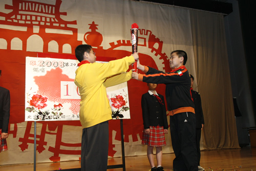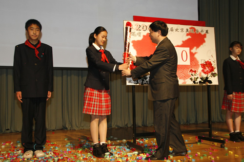 同学们刚刚结束紧张的期中考试,就身着整齐的校服,佩带鲜艳的红领巾,手持小国旗和五环旗,满怀喜悦的心情参加了庆祝仪式。