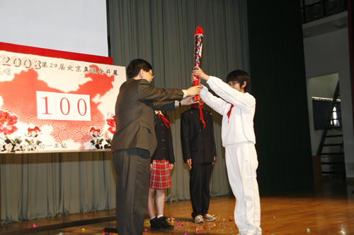活动在高唱《国歌》声中开始,学生代表和教师代表作了热情洋溢的发言,他们表达着一个共同的愿望――热切地盼望北京奥运会开幕,衷心祝愿北京奥运会圆满成功。学生群体诗朗诵顾拜旦的名篇《体育颂》,字里行间,体会着更快更高更强的奥林匹克精神。在倒记时牌揭幕后,进行了象征着“和平、友谊、进步”的模拟火炬传递。刘沪校长亲自把火炬交给第一名火炬手。最后进行了大型福娃表演。“祝2008北京奥运会圆满成功”横幅举上了主席台。伴随《五环旗下》的乐曲,礼花飞舞,现场气氛热烈而有序。许多同学积极报名为此活动服务,还有的同学积极准备小国旗和五环旗,积极制作电脑动画,设计高水平的倒记时牌。表现了高度的参与奥运的热情和积极性。