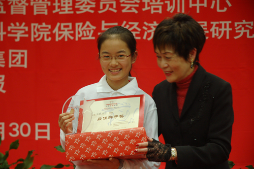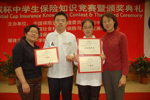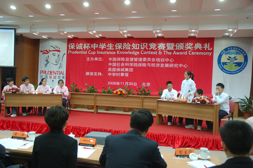 2008年11月30日,我校《保险伴你一生》选修课初三(2)班包颖、高二(1)班董伯羊同学联合北京十五中、206中学的两名同学组成“北京队”,参加了由中国保监会、中国社会科学院保险与经济发展中心、英国保诚集团联合举办的“保诚杯”全国中学生保险知识竞赛活动,与来自大连、江苏、四川和《中学生时事报》读者队同台竞技,取得第二名,包颖同学获得了含金量最高的“最佳辩手”奖。政治组的李芳、赵敏老师获得“优秀教师奖”。
