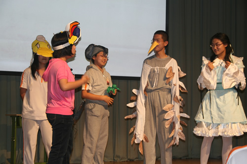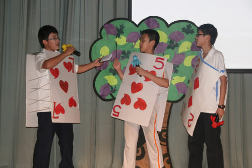 当天下午,活动的气氛活跃到了极点。竞赛代表队的同学们博学多识,思维敏捷,积极踊跃地回答问题;歌唱表演精彩纷呈,各具特色,展现了各班别样的风采;电影配音生动有趣,同学们在现场把不同角色演绎得惟妙惟肖;绕口令比拼紧张激烈,台上同学的惊人速度让每个观众都叹服不已。爱丽丝漫游仙境的短剧表演,更是为我们带来了一场视觉盛宴。流利的背诵,精彩的表演,华丽的背景,新颖的服装和道具,无一不是演员们辛勤付出的汗水和心血的结晶。最后,活动在四位英语老师的歌声中圆满落幕。