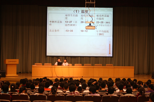 原高一9班的赵东平、苏明月同学揭开了附中古枣树死因之谜,原高一10班的王宁介绍了他们对汽车油耗的研究,原高一9班的李霖峣、红烨同学做了附中教室空间色彩搭配设计,原高一10班的朱钰、邱珊珊同学复原了耧车这种古老的农具。
