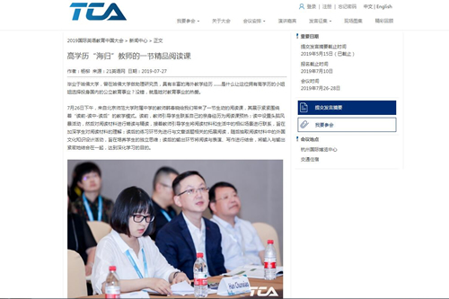 7月26日下午,韩春晓老师在“内容与语言融合式教学”分会场进行了发言,分享了我校英语教学团队依据库伯经验学习理论设计并实践的阅读课例,展示了我校英语组的“体验式教学”实践和成果,引发了到场学者的热切交流和一致好评。中国日报社21世纪英语网为此做出了专门报道。(https://tesol.i21st.cn/2019/25298.html)