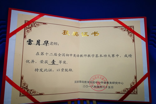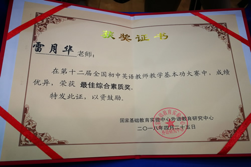 2018年4月21日至25日,在刚刚落幕的第十二届全国初中英语教师教学基本功大赛暨教学观摩研讨会中,优米app下载直播平台雷月华老师代表北京市赴郑州参加现场上课比赛,并荣获一等奖第一名和最佳综合素质单项奖。