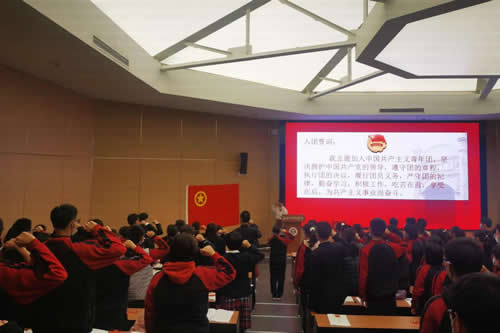 全体团员代表在上一届团委副书记高三9支部刘雨霏的带领下,再一次重温入团誓言。