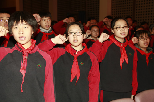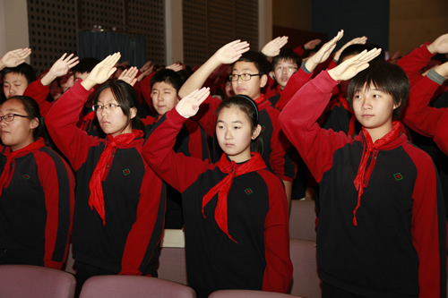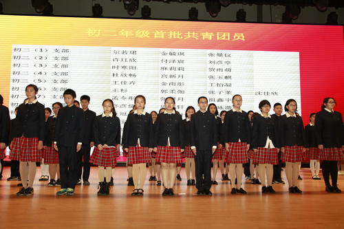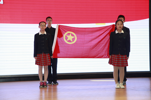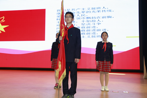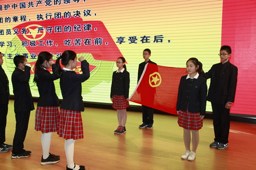 告别了少先队队旗,新团员们在团委书记张明瑶老师的带领下,面对庄严的团旗宣誓,随后唱响了中国共青团团歌。各班班主任也为这些新团员们佩戴共青团团徽。