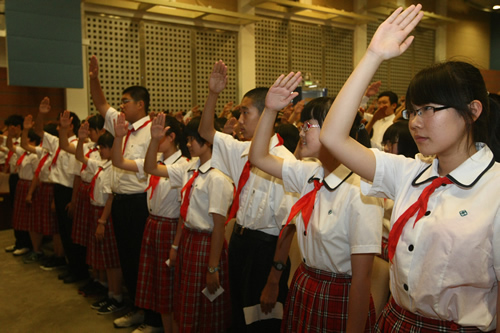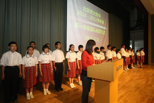 2011年5月31日下午,在校团委的组织下,2010-2011学年度初一年级退队建团仪式在优米体育总部地址电话会堂隆重举行。梁原草副校长、教导处况莉主任出席了仪式。