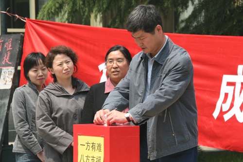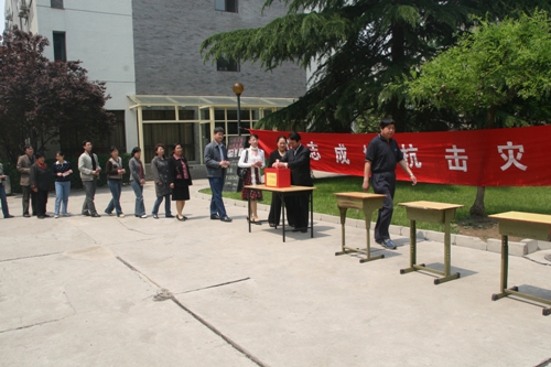 5月14日中午11:30,我校工会组织了“众志成城、抗击灾难”募捐活动。广大教职工积极为四川地震灾区捐款,奉献爱心,在短短两个小时的时间里,共募集30289元。这笔捐款将由学校工会送到宣武区教育工会。另外,还有部分教职工通过其他渠道和方式为灾区捐款。