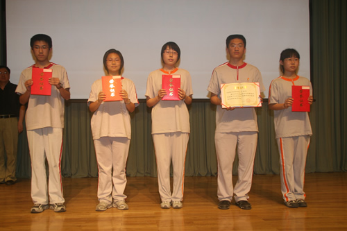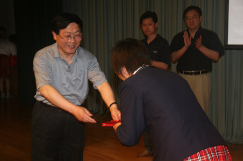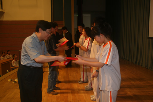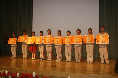 5月28日中午,校团委在礼堂举行了2008年五四红旗表彰大会,刘沪校长、许建勇副书记、梁原草副校长出席大会并为获奖团体及个人颁奖。校团委副书记高二11班贺紫嫣同学、志愿者服务队队长高二5班孟静同学、高一8班团支书王雪莹同学分别代表校团委、志愿者服务队、区教育系统优秀团支部做工作汇报。梁原草副校长向获奖团体及个人表示祝贺并对全校团员提出更高要求。