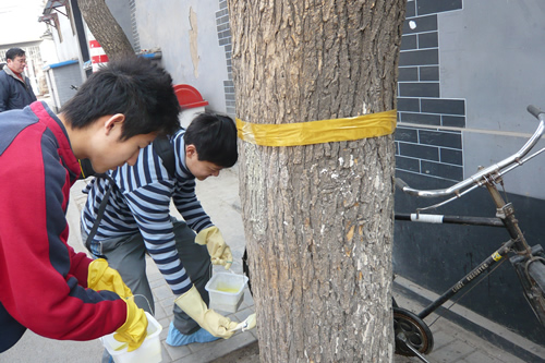 4月4日上午九点,活动在椿树园小区中心花园准时开始。高一、高二近40名志愿者分成两组,一组同学负责在街道所属社区粉刷树木,为树木防虫;一组同学负责发放环保宣传资料并向社区居民宣讲植绿护绿知识。在同学们的共同努力下,百余棵树在两小时内全部刷完,有的同学意犹未尽,还高兴的和自己“护”过的树合影留念。任务的圆满完成得到了社区领导和居民的高度赞扬。