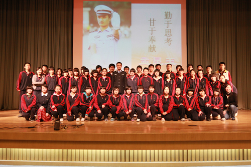 一位普通的年轻交警,成为了网络名人,随着工作和生活见诸互联网,这位民选的北京最帅交警,感动了我们每一个人。他就是我校的校外辅导员,孟昆玉警官。在本学年的开学典礼上,孟警官曾和我们全校师生分享了他的工作体会和人生感悟。在五四青年节前夕,已经受邀前往上海世博会,即将出发的孟警官,又专程来到了我校,在附中百年会堂与高一、高二年级学生再一次进行了近距离的交流。