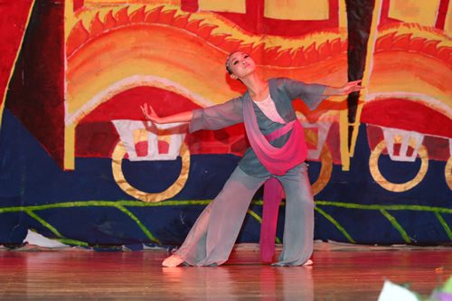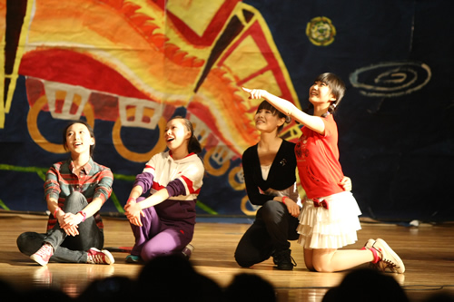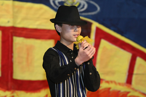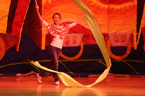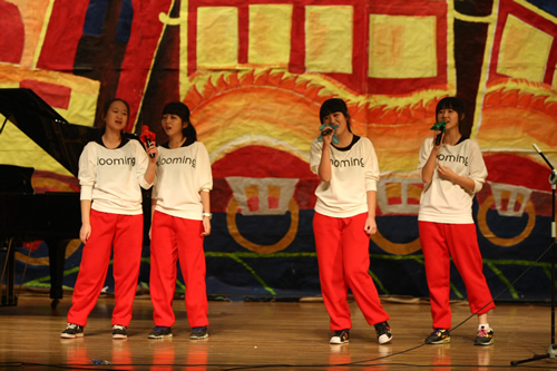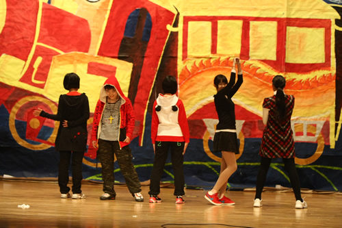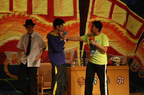 附中学生会的同学利用课余时间绘制了主题为“星空”的幕布,将畿米的漫画星空与中国传统的金龙结合在一起,绘成美轮美奂的背景。